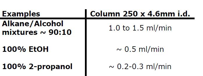 ①최고 흐름 속도는 이동상의 점도에 따라 달라집니다. 반드시 최대 압력 범위(50 bar)가 넘지 않도록 적절한 흐름 속도를 맞춰 컬럼에 무리가 가지 않도록 주의하여 설정 합니다.